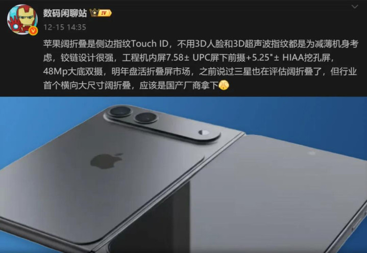 如今折叠屏iPhone的信息已逐渐清晰,博主@数码闲聊站称,折叠屏iPhone采用阔折叠形态+指纹识别、5.25英寸单挖孔外屏+7.58英寸无挖孔内屏、配备了后置双摄。