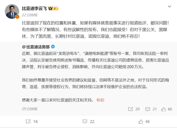 比亚迪法务部今日发文表示,近期就比亚迪起诉“龙哥讲电车”、“满格电新能源”等账号一案,我司收到法院一审判决。