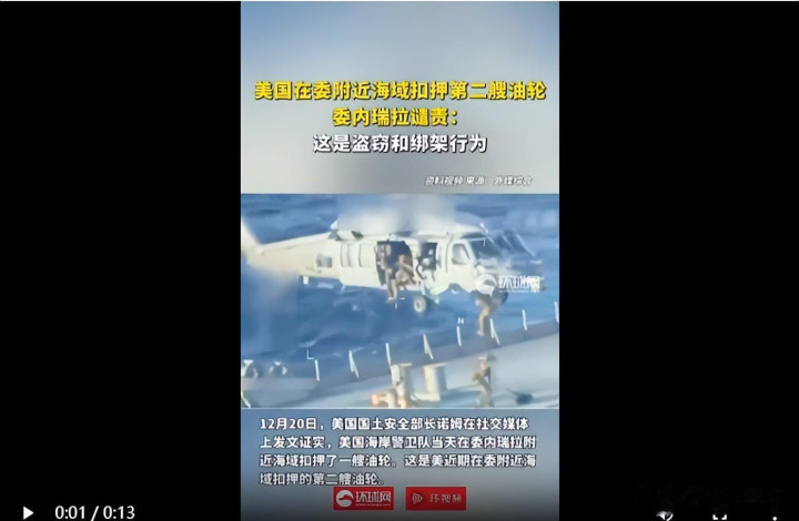 12 月 20 号,在美国附近的加勒比海,美国海岸警卫队出动直升机,让武装人员降到一艘叫 “世纪号” 的油轮上,直接把船扣了。