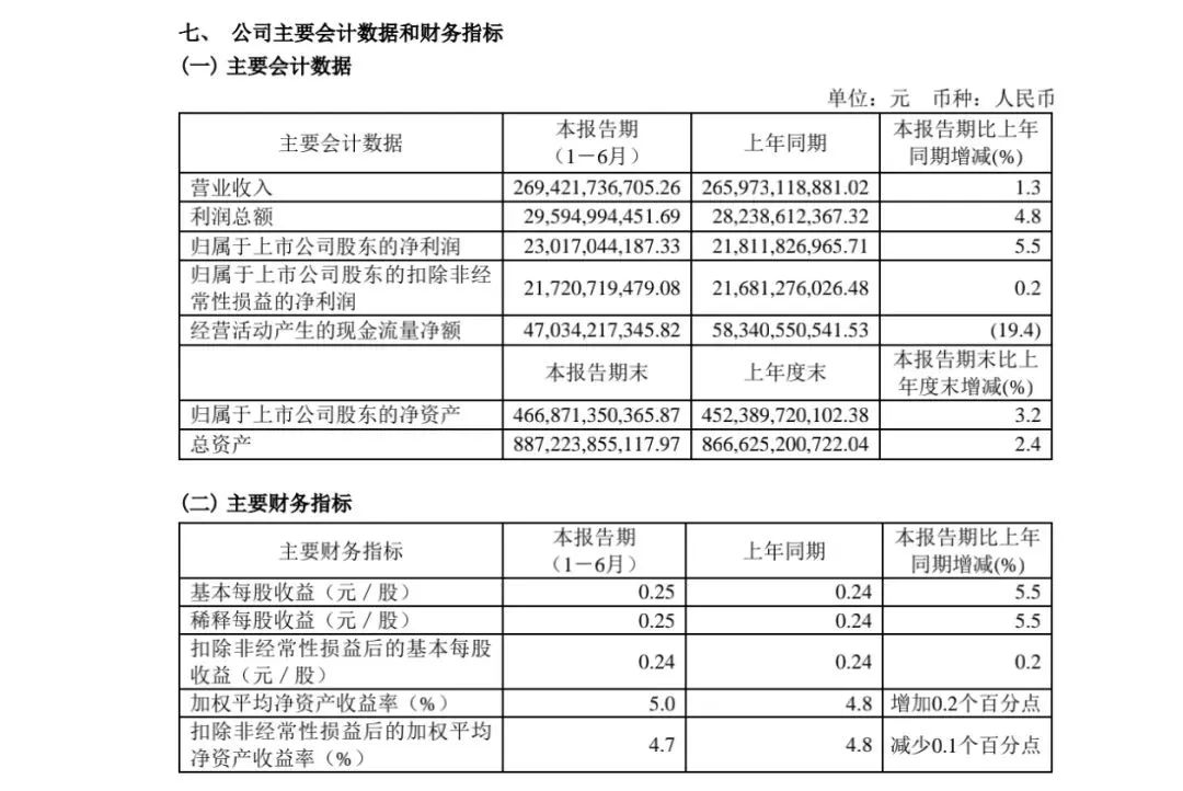 2025年8月14日,中国电信发布2025年半年度报告。报告显示,公司上半年实现营业收入2,694亿元,同比增长1.3%;归属于母公司股东的净利润达230亿元,同比增长5.5%;基本每股收益为0.25元,同比增长5.5%。董事会同时宣布派发中期股息每股0.1812元(含税),总额约165.8亿元,现金分红比例达净利润的72%,创历史新高。