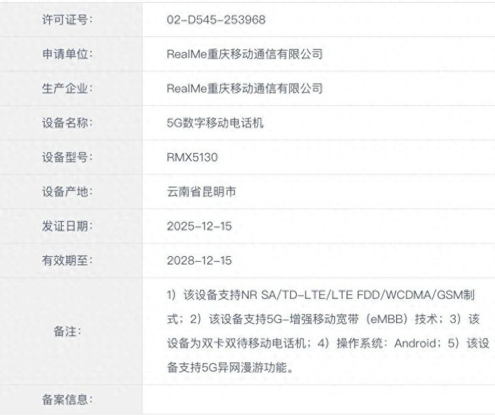 据悉,一款型号为RMX5130的真我旗下新机于近日通过了认证。其中没有显示详细的产品系列信息,但有推测认为其是真我 16 Pro+。