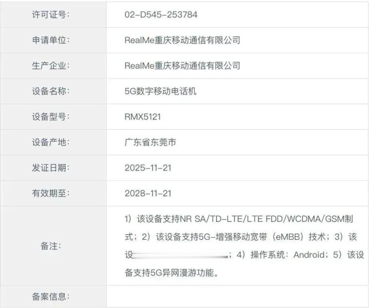 在此之前,一款型号为RMX5121的真我旗下新机通过了认证。其中没有详细的产品系列信息,但有推测认为其有可能是真我 16 Pro。