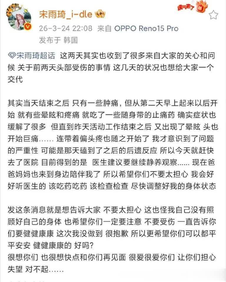 最让人揪心的当属宋雨琦,此次缺席并非偶然,而是源于一场令人揪心的舞台意外。此前,宋雨琦随(G)I-DLE开展曼谷巡演,3月22日的演出中,因升降台机械故障,她在台侧表演时头部遭受猛烈撞击,当场疼痛流泪,却依旧强忍不适完成了整场演出,敬业程度令人动容。可谁能想到,撞击的后遗症远比想象中严重,次日她便出现持续眩晕和偏头痛症状,甚至连正常活动都受到影响,引发全网热议。