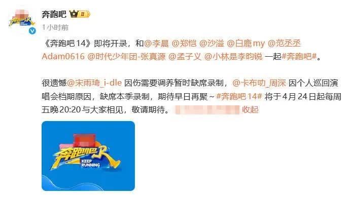 全网破防!3月25日,《奔跑吧》官方账号正式发文,官宣了一则让无数观众心碎的消息:宋雨琦与周深将缺席本季节目录制,配文“很遗憾宋雨琦因伤需要调养暂时缺席录制,周深因个人巡回演唱会档期原因,缺席本季录制,期待早日再聚”。消息一出,相关话题瞬间霸榜各大社交平台,#宋雨琦周深缺席奔跑吧# #宋雨琦头部撞伤后续# 等话题火速冲上热搜前排,一半是粉丝的心疼担忧,一半是网友的争议吐槽,未播先炸,热度直接拉满。